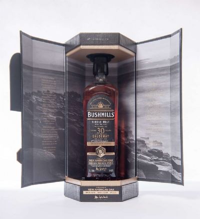 The highest-aged expression so far in the distillery's Causeway Collection.The Bushmills 30 Year Old New American Oak Cask Single Malt is matured for 14 years in Oloroso sherry butts and Bourbon barrels before being finished for 16 years in American oak casks. The final product was bottled in September 2020 and features notes of honeyed malt, vanilla, chocolate and warm wood.